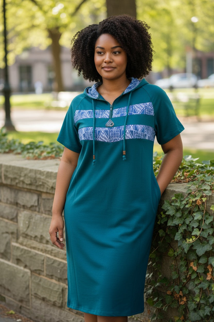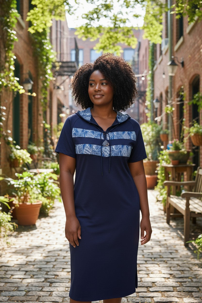 Ndop African Pattern Women Comfortable Casual Dresses Hooded Stripe Pocket, Short Sleeve Knee Length Fashion Dress